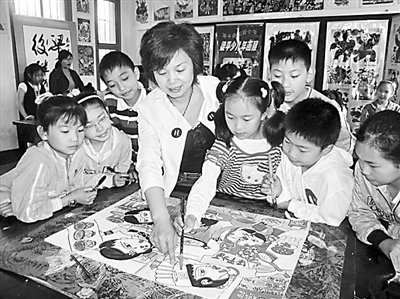 6月11日,重庆市梁平县实验小学高级美术教师、梁平年画传承人莫绍萍在指导小学生学习年画技艺。为保护和传承国家级非物质文化遗产梁平年画,该校除把梁平年画纳入校本教材进行教学外,还利用课外活动时间,为喜爱绘画的学生义务办起培训班,讲解梁平年画的历史渊源,指导学生创作梁平年画。近年来,学生创作的110多幅梁平年画作品在国内外获奖,为梁平年画的传承、发展打下了坚实基础。 (刘辉 摄)