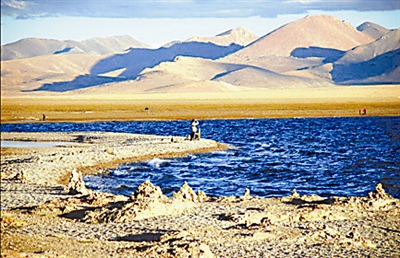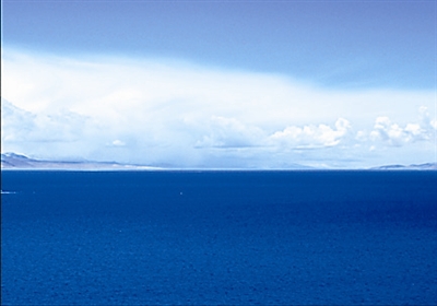 远处水天相接的地方,更让人分不清是天还是水。那天边挂着的一带白云,倒映在湖中就像一条长长的哈达,该是神灵的祝福吧。在这纯净无尘的圣地,周围几乎不见其他的人,偶尔有一二个藏民牵着马匹从湖边走过。耳边,除了湖水轻轻拍打的声音,一切都那么地静。世界上最高最大的天水相连的圣地,千万年来,就是这样静静地让人瞻仰。