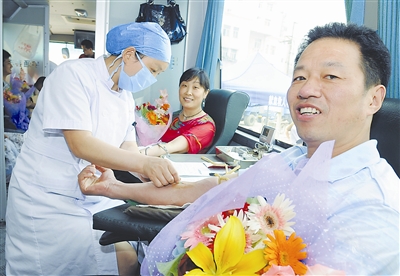 6月14日,安徽滁城下岗职工冯华夫妇在街头采血点献血,他们已经连续五年坚持无偿献血。