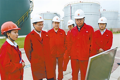 长庆油田公司总经理冉新权(左二)与采油三厂领导研究部署油田发展