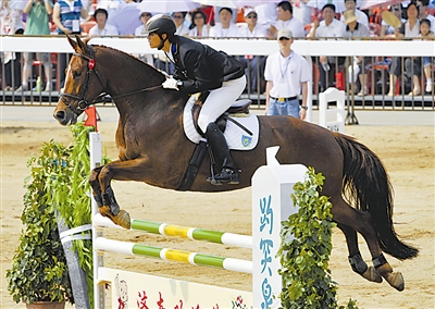 6月14日,2009年全国马术三项赛冠军赛暨十一运会马术测试赛结束了场地障碍赛的角逐。最终,广东队夺得三项赛团体冠军,上海队、山东队分获二、三名。图为广东队选手李静敏在场地障碍赛中。