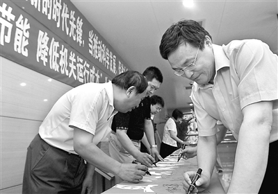 6月15日早上7点半,在全总机关一楼大厅,干部职工纷纷在印有“中直机关抵制商品过度包装万人签名”的横幅上签名。此次活动是中央和国家机关开展的以“推进公共机构节能,降低机关运行成本”为主题的节能宣传周活动的一部分,在6月14日至20日的活动周期间,倡议机关职工“绿色出行”,乘坐公交、骑自行车或步行上下班,并将在6月18日停开办公楼空调、关闭办公楼照明一天。本报记者 杨登峰 摄