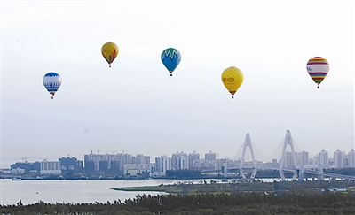 6月15日,2009第三届海口热气球节暨H1中国热气球挑战赛落幕。本次比赛共有25支热气球队参赛。图为参赛的热气球飞翔在清晨的天空中。新华社记者 赵颖全 摄