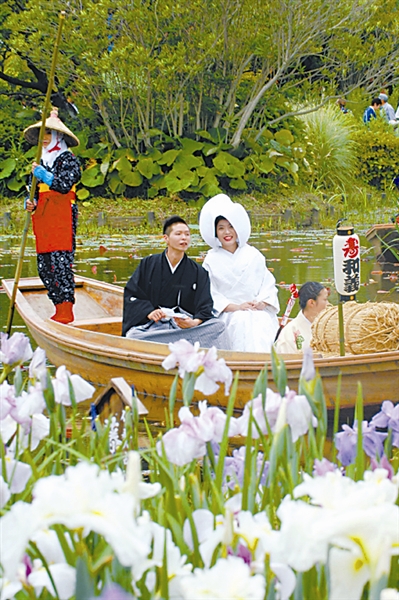 6月14日,一对身穿日本传统服装的新人在千叶县佐原市水生植物园内举行水上婚礼。新人乘坐游船顺水而下,两岸树木葱郁,沿途游客不断送去祝福。水上婚礼是佐原市独具特色的婚庆和观光活动。