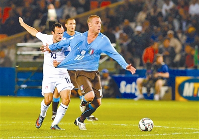 图为意大利队球员德罗西(右)与美国队球员多诺万拼抢。新华社记者 徐速绘 摄