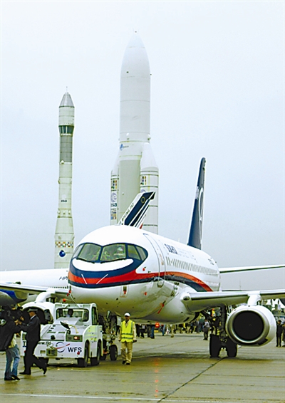 6月15日,俄罗斯苏霍伊公司最新研制的商用飞机Superjet100在第48届巴黎国际航展首日亮相。久违近20年后,此次重返巴黎航展的苏霍伊雄心勃勃,不仅带来了Superjet100,还确定了宏伟的市场开拓目标。新华社记者 张玉薇 摄