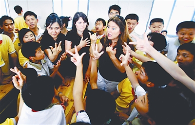 6月10日,美国伊利诺伊大学的江和博士与江西九江博爱聋校的学生用手语进行交流。江和是美国伊利诺伊大学教育心理系博士生、美国国家自然科学基金委员会前研究员,于6月5日带领两名研究生来到九江博爱聋校义务支教一周。胡国林 摄