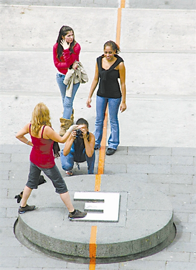 6月16日,在厄瓜多尔首都基多附近的赤道纪念碑前,一名游客在拍照留念。在厄瓜多尔首都基多以北27公里的赤道线上,矗立着1982年8月9日建成的赤道纪念碑,联合国教科文组织确认这里是世界上位置最准确的赤道标记。作为厄瓜多尔最著名的旅游景点,赤道纪念碑每年吸引大量游客。来这里参观的游客都喜欢两脚站在黄线两边拍照留念,显示自己是脚踏两半球的人。