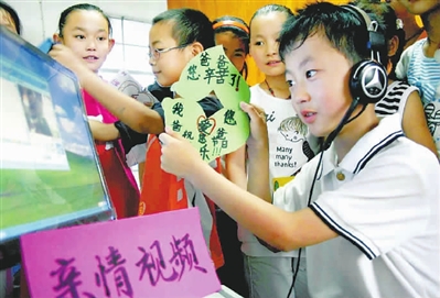 6月18日,在安徽省含山县仙踪小学,留守孩子张旭东正通过视频向在上海打工的爸爸展示自己制作的父亲节贺卡。当日,安徽省含山县仙踪小学开展以“打工爸爸,我想对您说……”为主题的留守孩子感恩父亲主题教育活动。程千俊 摄