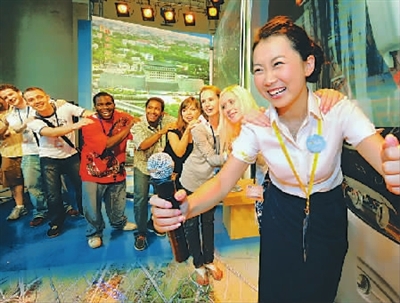 图为“北京赛笛芭诗城市观光”展台前“乘大巴、游北京”的游戏引起了众多国外客人的兴趣。本报记者 张宪 摄