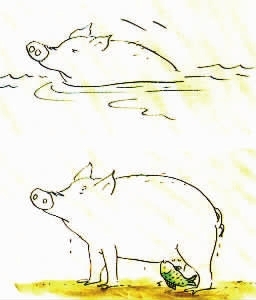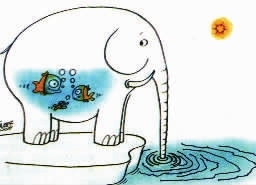 湖中的水已近干涸,大象将鱼儿“喝”入肚中,看似挽救了几条生命。福兮?祸兮?