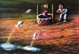 干旱殃及鱼池,奄奄一息的鱼儿,从人们汲水看到了一线生机,它们认为挣扎一路就会获得新生。假如井水干了呢?