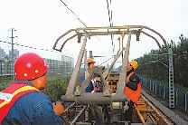 图为6月18日,中铁电气化局集团一公司员工在进行接触网冷滑试验。
