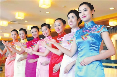 国内总装的第一架空客A320飞机即将交付。22日,将在这架飞机上为旅客提供服务的川航“祥凤”乘务组的7名空姐身着蜀绣凤凰图案的旗袍亮相天津。新华社发 余坪 摄