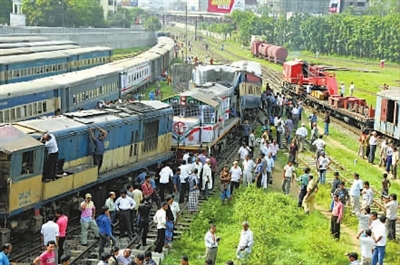 6月22日,人们在孟加拉国首都达卡发生火车相撞事故的现场围观。两列客运火车当天在达卡的一座火车站发生相撞事故,造成至少2人死亡,7人受伤。新华社发 扎曼 摄