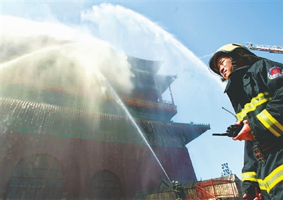 6月24日上午,一场针对高层古建筑的消防演习在北京鼓楼举行,演习模拟鼓楼突起“火灾”,几十名“游客”在第一时间被转移,两分钟后,70余名官兵和10辆消防车赶到,1分钟后,大火被扑灭。