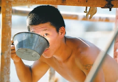 6月24日,济南上空烈日当头,酷热难当,气温达到38摄氏度以上,街头如同火烤。图为工人们冒着酷暑工作。罗波 摄