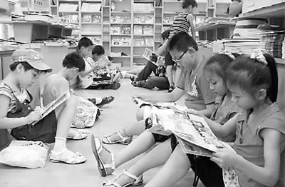 时近盛夏,苏州最高气温达36.1摄氏度,各大书店凉爽的店堂里挤满了小读者,孩子们一边纳凉一边享受读书的乐趣。王建康 摄