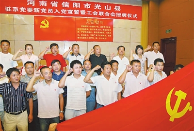 6月26日上午,来自河南省信阳市光山县的22名在京务工人员在北京举行了集中入党宣誓仪式,同时,信阳市总工会为在北京新成立的16家工会联合会进行了授牌。光山县是革命老区、国家扶贫开发重点县,全县81万人口中常年在外务工人员达19万,当地从2004年开始在外出务工党员集中地建立党组织,目前已建47个,将88.4%的流动党员纳入了党组织的管理。本报记者 杨登峰 摄