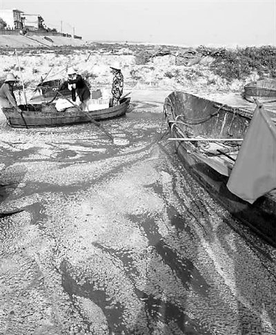 安徽巢湖水面漂浮着蓝藻(6月25日摄)。