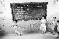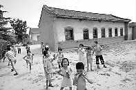 图②:学生在教室后的黑板前玩耍,黑板下的墙皮剥落,露出里面的土坯。