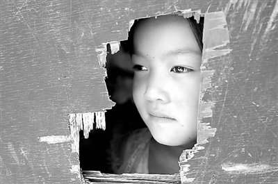 图①:二年级学生杨安妮透过教室门上的破洞向外看。