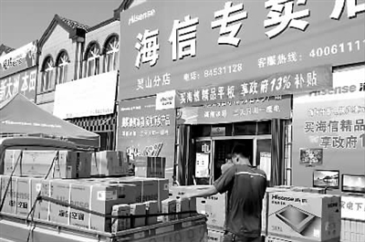 在山东省即墨市灵山镇华美海信电器专卖店,一名工作人员正在进货。 本报记者 李秀玲 摄