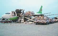 海口美兰机场货运赶装海南省红十字的救灾物资