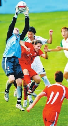 6月30日,中国队球员王冬妮(后左二)和队友王晨(后右一)与波兰队球员拼抢。当日,在贝尔格莱德举行的第25届世界大学生运动会女子足球小组赛中,中国队以3比0战胜波兰队。