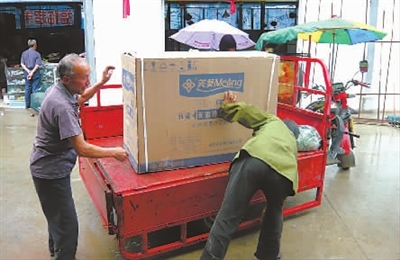 鲜丽平一家人买了冰柜兴高采烈运回家。本报记者 高莎 摄