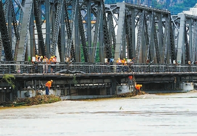 7月5日,工作人员在柳江铁路桥桥墩处清除洪水带来的杂物,保障铁路桥安全。