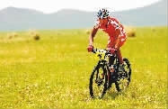 7月5日,在第三届中国铁木真国际草原山地车挑战赛男子专业组85公里比赛中,中国选手王磊以2小时56分30秒74的成绩获得冠军,并以5小时47分7秒40的成绩获得了总成绩冠军。新华社记者 任军川 摄