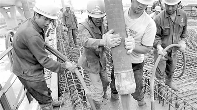 7月7日上午,中铁二局职工正在为用于成灌铁路建设的第389孔特大预制梁浇注水泥。成灌铁路是四川灾后重建的重要项目,具有工期紧、工艺先进、施工质量要求高等特点。为了确保工程质量,负责材料选供的中铁二局物资公司成都分公司成灌铁路项目部打破常规,选供最优质的水泥、钢材等施工材料,以确保这条现代化高速铁路优质、按时通车。