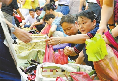 7月8日早晨,乌鲁木齐市民在光明路附近的一个早市买菜。