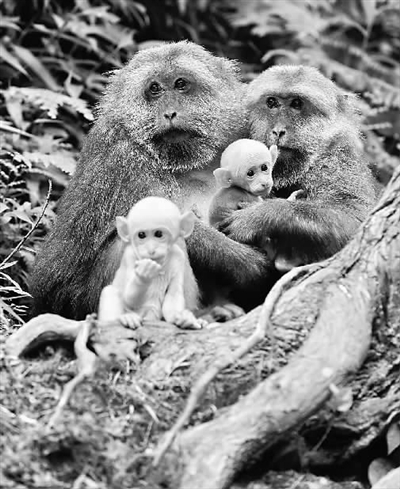 一只母猴在呵护两只幼猴。 新华社记者 张国俊 摄