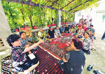 7月11日,新疆霍城县人大副主任、县工会主席古丽加汗(左一)在兰干乡阳光村向村民讲述“7·5”打砸抢烧严重暴力犯罪事件的真相。