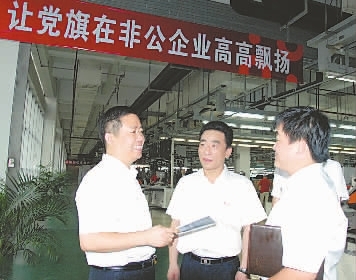 周海江总裁(左)在车间与技术人员交谈