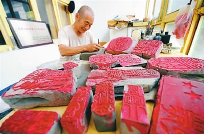 7月12日,王天德老人在用青砖刻制印章。山东省淄博市临淄区梧台镇王青村七旬老人王天德历时一年,用数块青砖刻制的大型组合“全运情”印章于近日完成。老人精心刻制的印章中包括“全民全运、全运圣火传中国、体育健儿创辉煌”等内容。新华社记者 范长国 摄