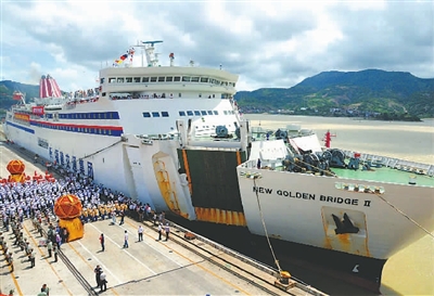 当日上午11时,“新金桥Ⅱ”豪华客滚轮载着19个旅游团、630名旅客从福建福州马尾出发直航台湾基隆港。这是两岸海上客滚直航福州马尾首航,也是大陆直航台湾本岛的第一艘客轮。新华社记者 来建强 摄