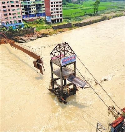 达州市宣汉县华景镇连接前河两岸的铁索桥被洪水冲断(7月14日摄)。