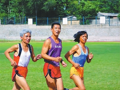 图为燕山长跑队中的姚延钊(左)、刘伟和王玉清(右)在燕山石化公司田径场征战100圈。文/图 谢桂玲