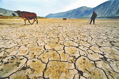 7月15日,甘肃武威黄羊川水库,村民赶着牛从干涸的水库库底经过。该水库始建于1958年,总集水面积达405平方公里,保灌面积35万亩。7月13日,甘肃省防汛抗旱指挥部发布消息:截至7月12日,全省受旱面积达1720万亩,37万人饮水困难。柴魏 摄