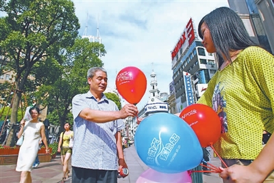 7月15日,在上海南京路步行街,志愿者将五彩缤纷的气球赠送给路人,希望他们养成“垃圾不落地,杂物随身走”的良好习惯。当日是上海的环境清洁日,在城市志愿者的带动下,众多上海市民参与了“我微笑 我捡起”活动,自觉清洁身边的城市环境。