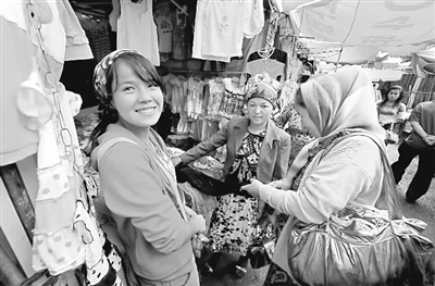 7月19日,伊宁市“汉人街”服装经营户热孜万古丽(左)热情接待顾客。