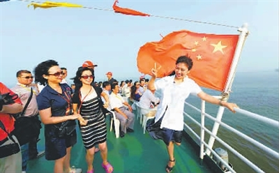 7月20日下午,在北戴河休养的千名劳模登上游船出海,饱览渤海湾的美丽景色。劳模们兴奋地享受着在海上航行的感觉,并争相与五星红旗合影留念。本报记者 张宪 摄
