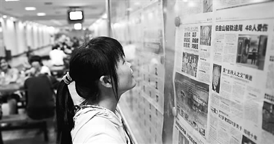 7月20日,一位学生正在防空洞内看报纸。