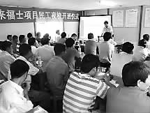 近日,中建三局总承包公司成都来福士广场项目民工夜校正式开班,为农民工开辟了学习交流的平台。据悉,民工夜校将结合农民工需求与项目工作实际进行课程安排设置,并将施工现场安全防护知识、消防治安注意事项作为夜校第一讲。程超 龚怀东 摄