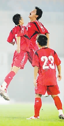 7月28日,上海队球员庆祝进球。当日,在山东淄博进行的全运会男子足球甲组四分之一决赛中,上海队以1比0战胜河北队,晋级半决赛。