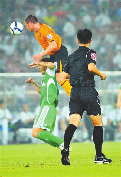 7月29日晚,2009英超亚洲杯赛事在北京工人体育场展开,北京国安通过点球大战不敌英超赫尔城队。图为双方激烈争夺场面。本报记者 许之丰 摄