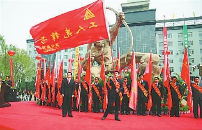 潞安集团党委副书记、工会主席曹晨明为工人先锋号授旗